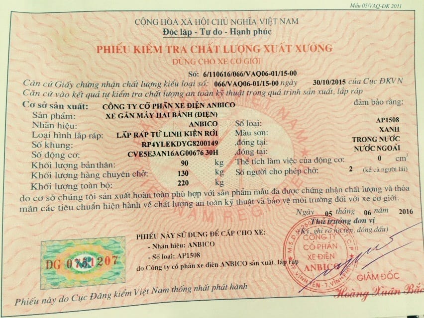 + Hồ sơ xe: bao gồm cả giấy khai đăng kí biển số xe điện.