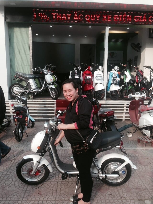 Mặc dù "bụng mang dạ chửa" nhưng chị Phạm Hoa vẫn vui tươi, hồ hởi khi đi mua xe đạp điện