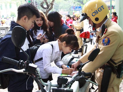 Cảnh sát giao thông hướng dẫn học sinh đăng kí xe điện